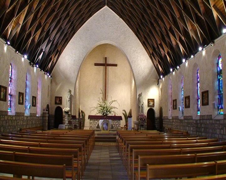 La voûte de la nef, faite d’une charpente en bois lamellé, donne une ambiance chaleureuse.