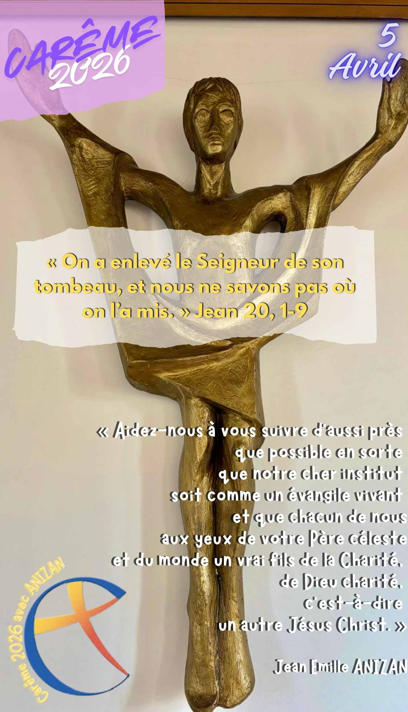 « Aidez-nous à vous suivre d’aussi près que possible en sorte que notre cher institut soit comme un évangile vivant et que chacun de nous aux yeux de votre Père céleste et du monde un vrai fils de la Charité, de Dieu charité, c’est-à-dire un autre Jésus Christ. » Père Anizan