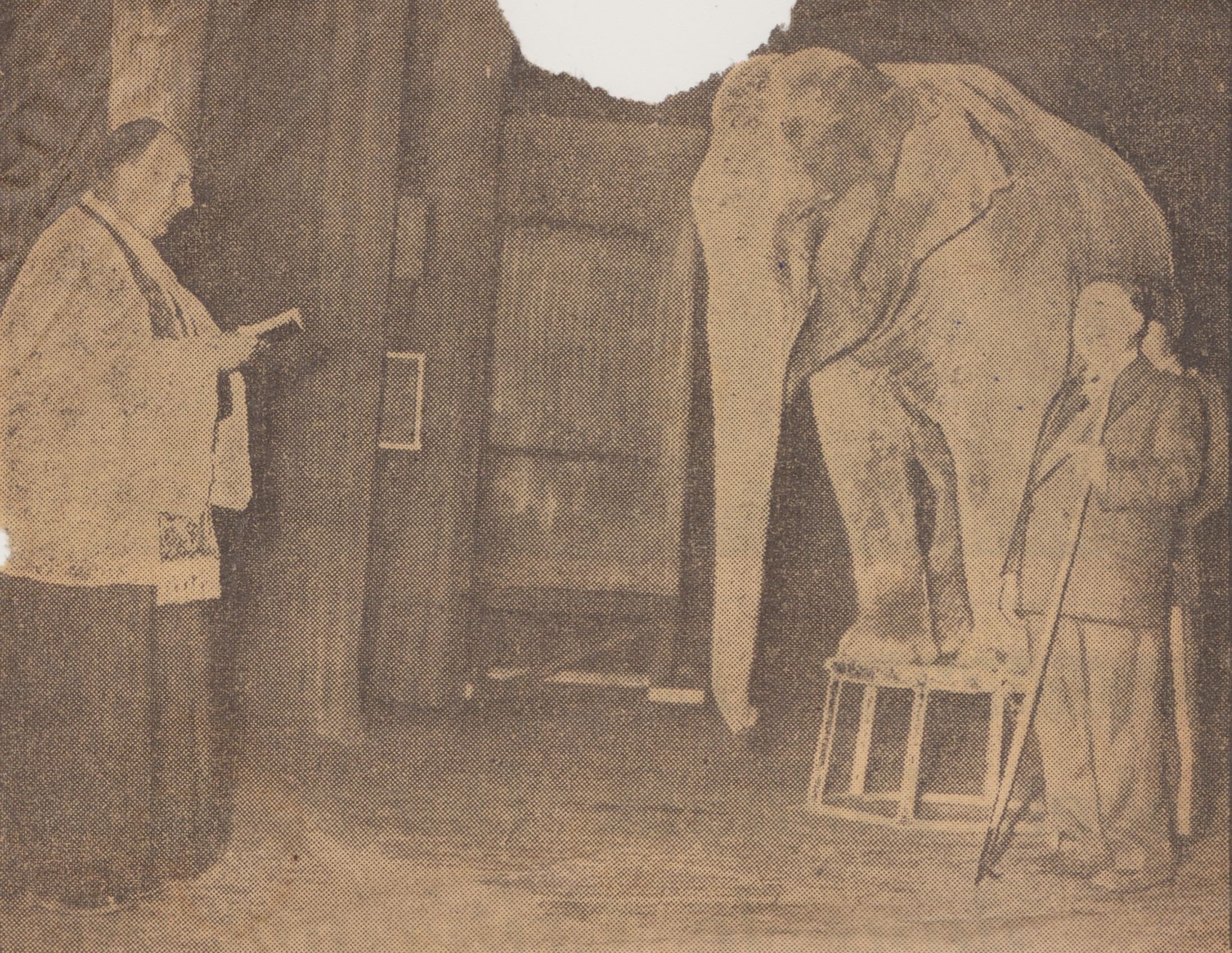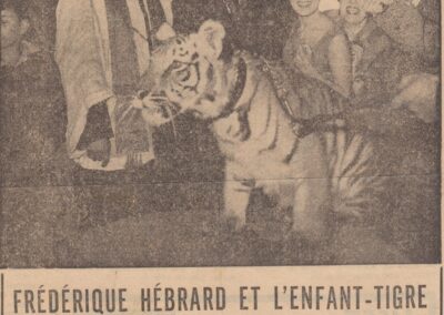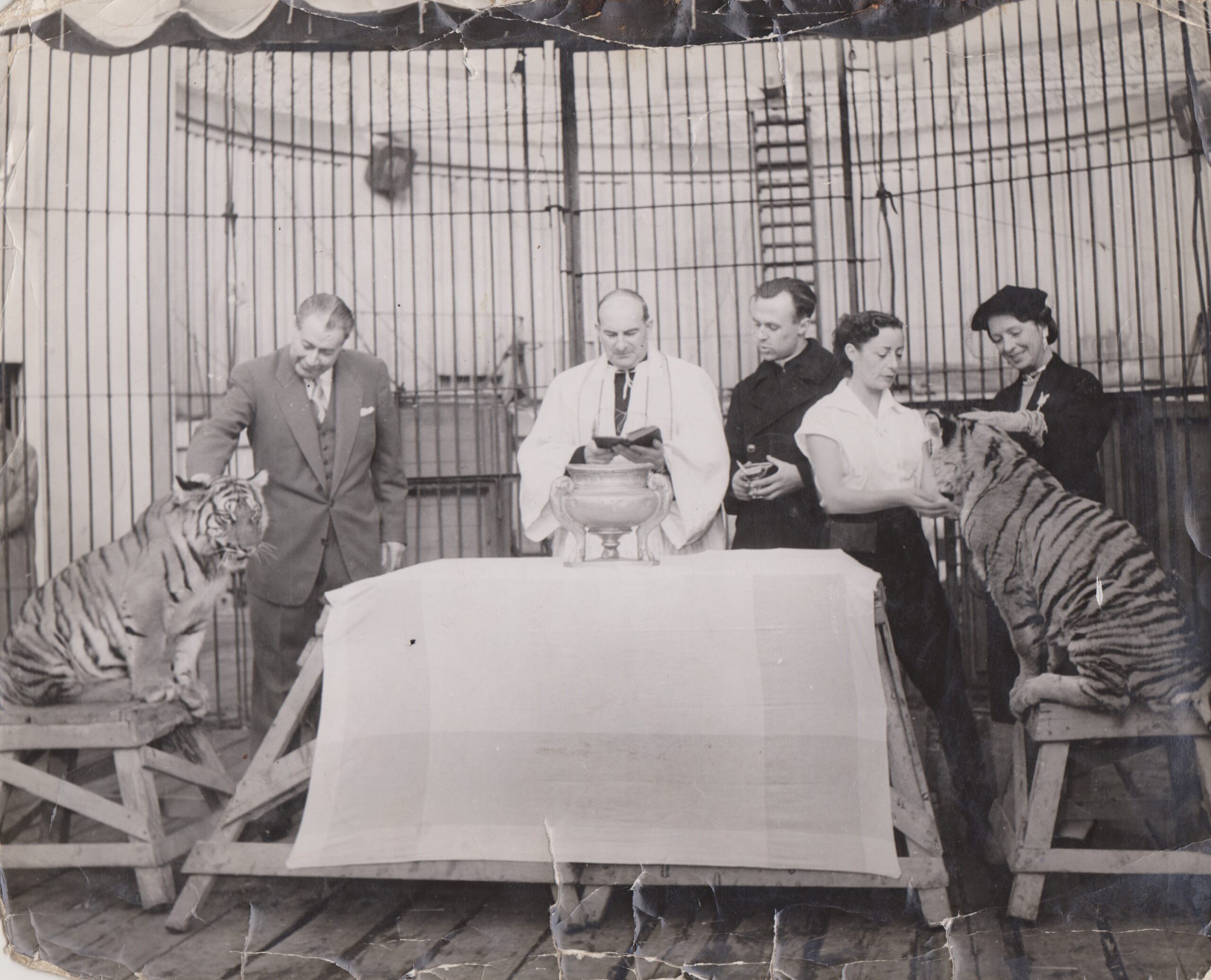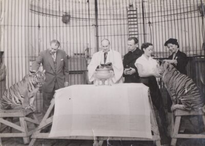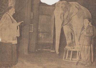 Le père Louis bénissant des animaux de cirque (1950-1962, archives des Fils de la Charité, 2E10/04, n°319 et 2545/bis)