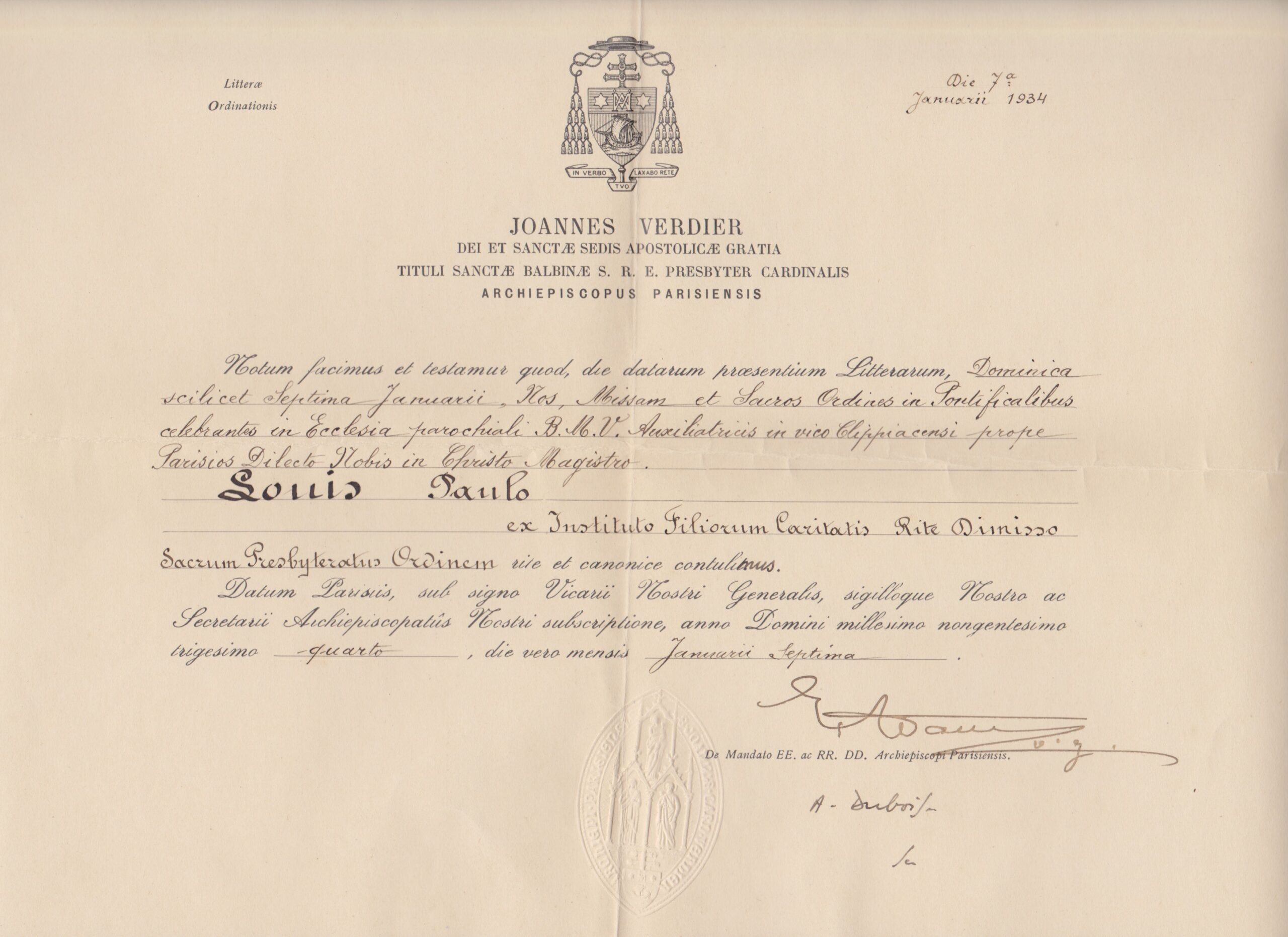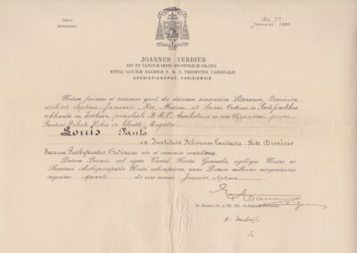 Lettre d’ordination de Paul Louis (1934, archives des Fils de la Charité, 2E10/03)