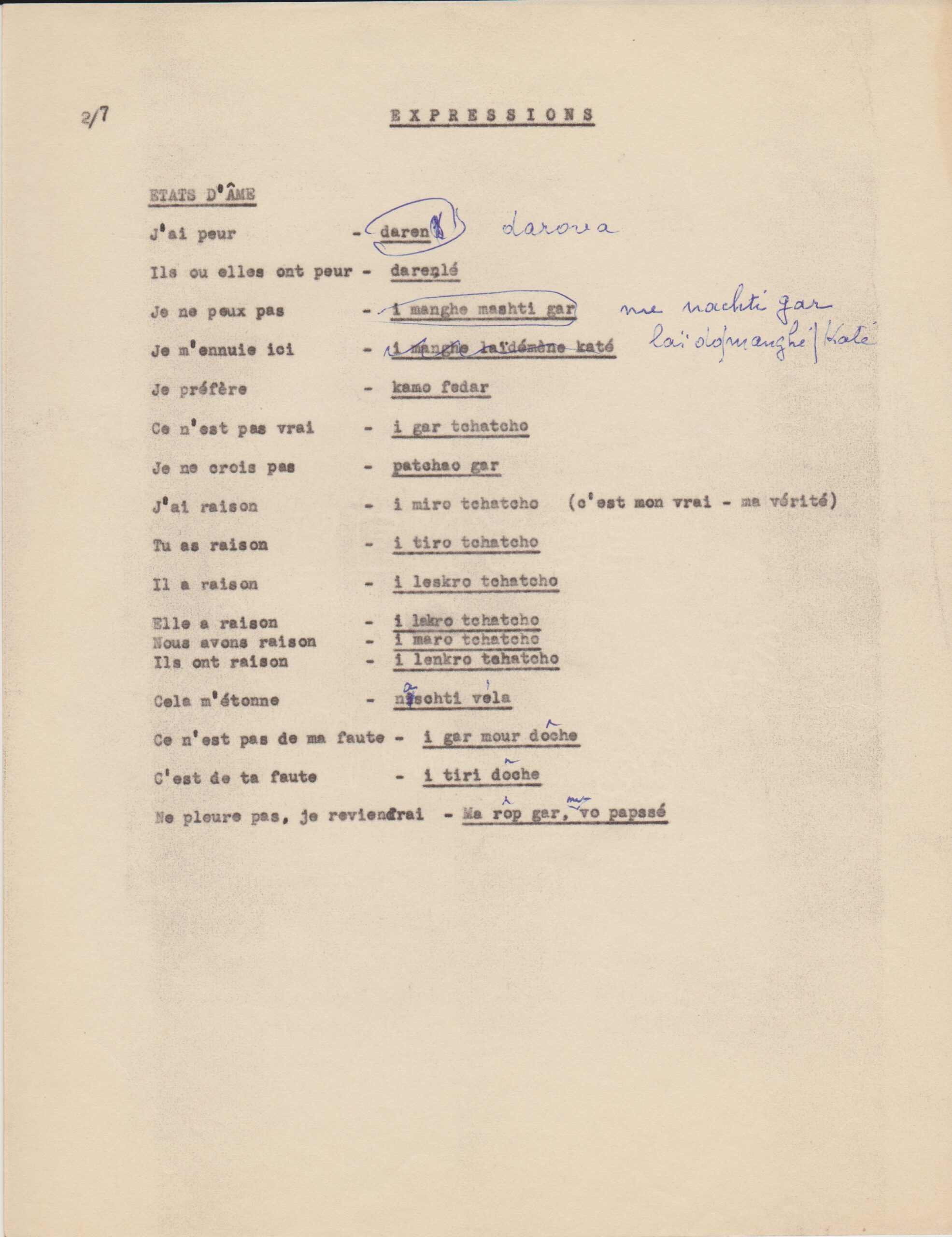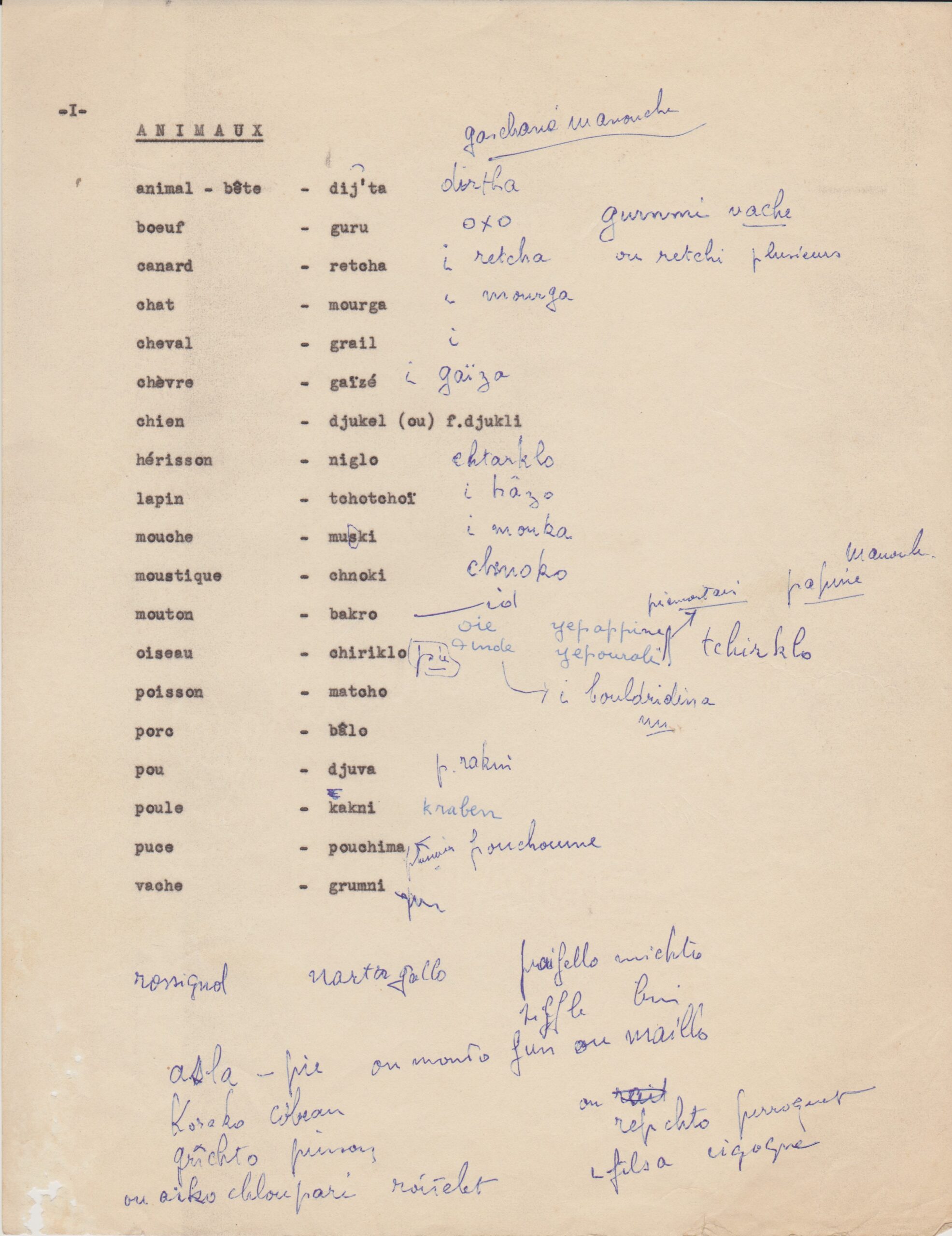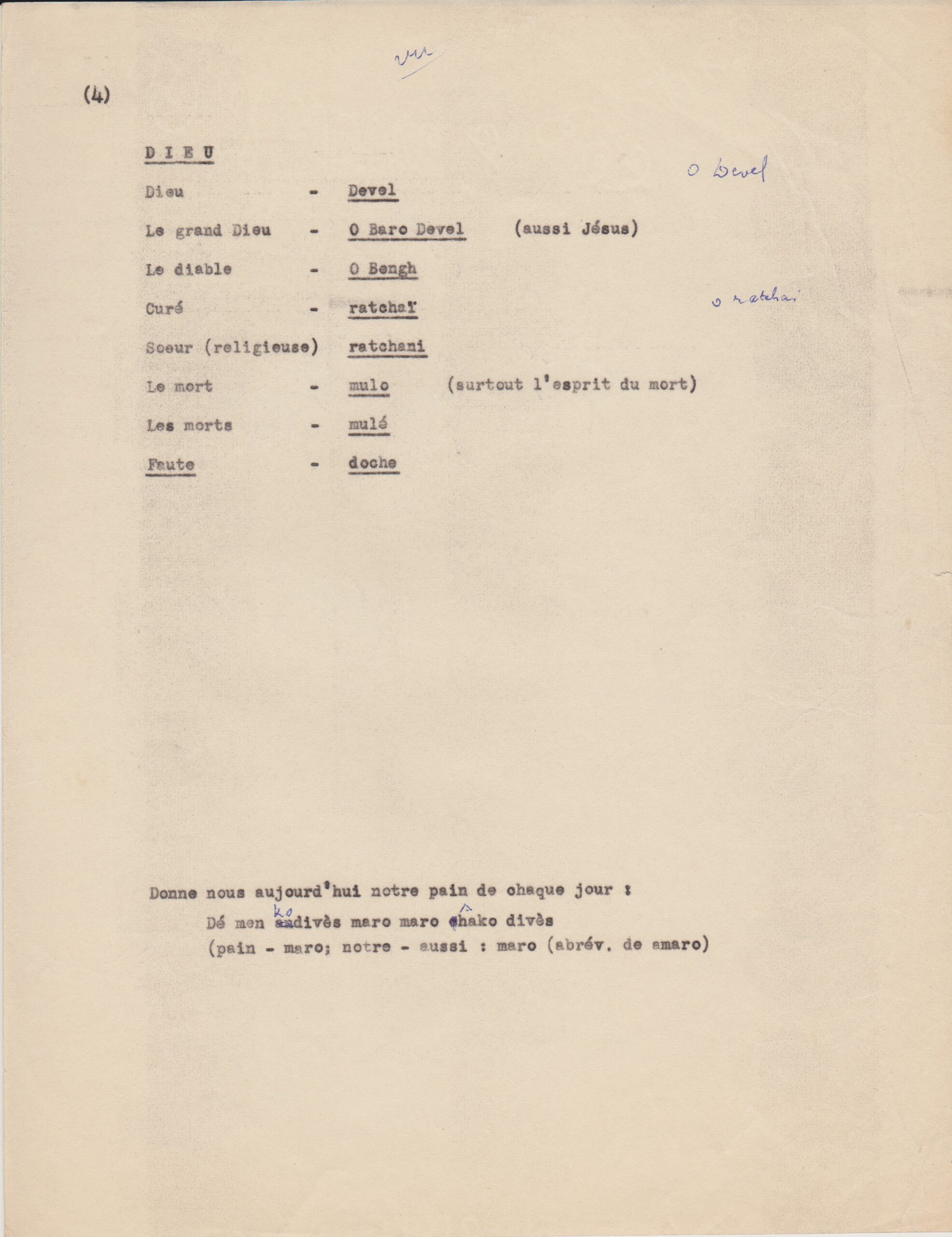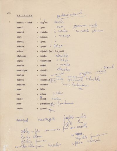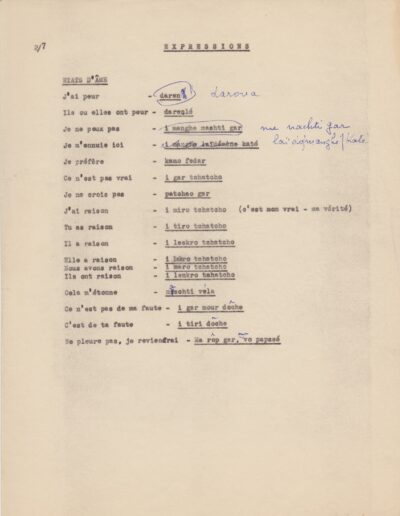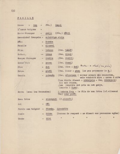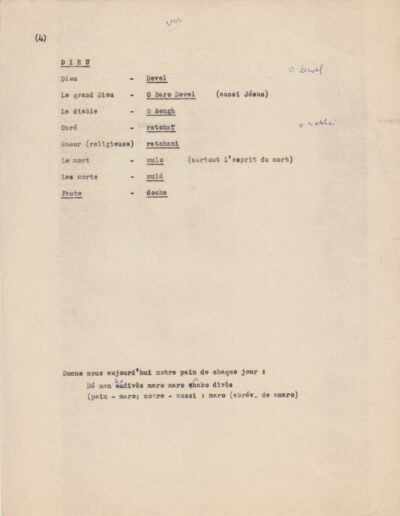 Listes de vocabulaire tzigane, avec annotations du père Louis (1950-1962, archives des Fils de la Charité, 2E10/04)