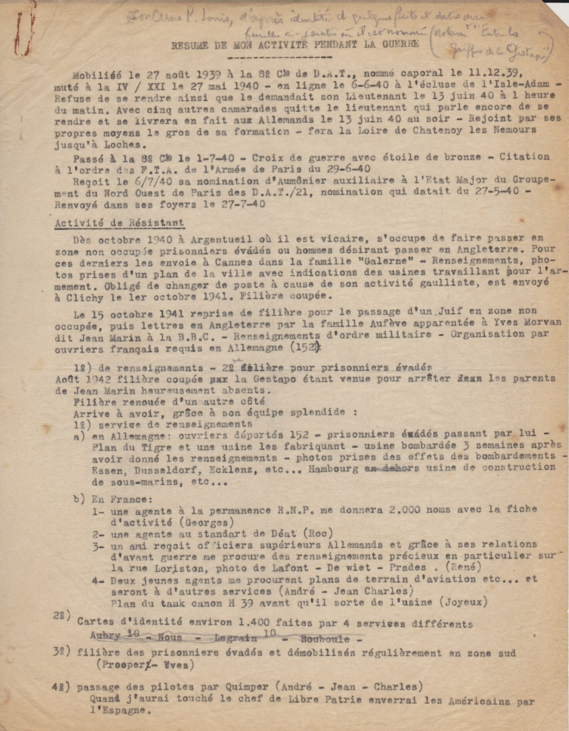 Résumé des activités du père Louis pendant la guerre (vers 1945, archives des Fils de la Charité, 2E10/05)