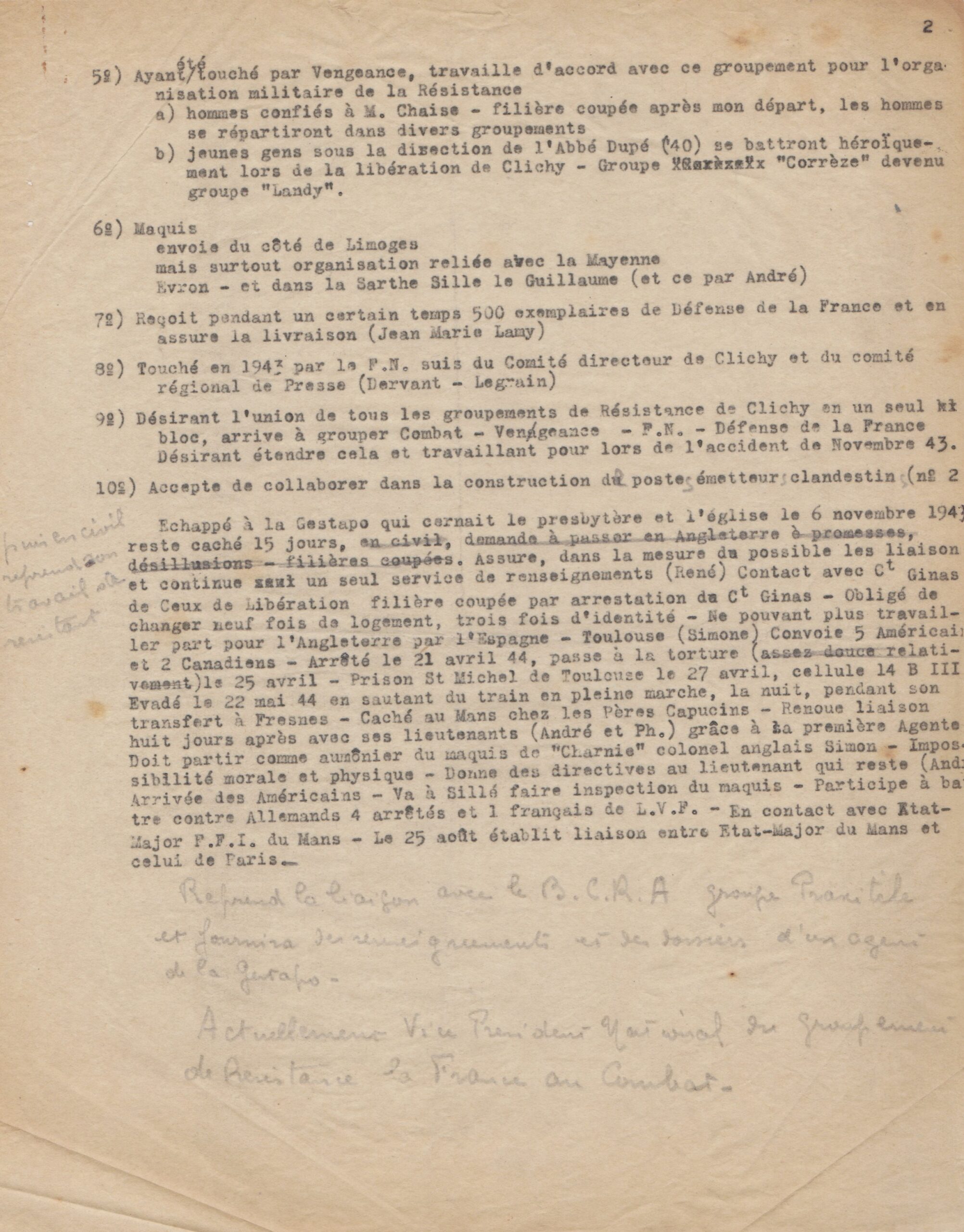 Arrêté, spolié et interrogé par la Gestapo, il subit coups et torture sans rien avouer. Envoyé dans une prison à Toulouse, il apprend qu’il va être transféré à Fresnes, possiblement pour y être fusillé. Il s’évade pendant le transfert en sciant les barreaux du wagon à bestiaux où il était enfermé, puis saute du train en pleine marche. Il est caché par des religieux puis continue la lutte sous le nom de “l’Abbé Choc”. Il se met en liaison avec un maquis de la région et participe à libérer le Mans, puis rentre à Paris pour le dernier jour de la Libération de la ville.