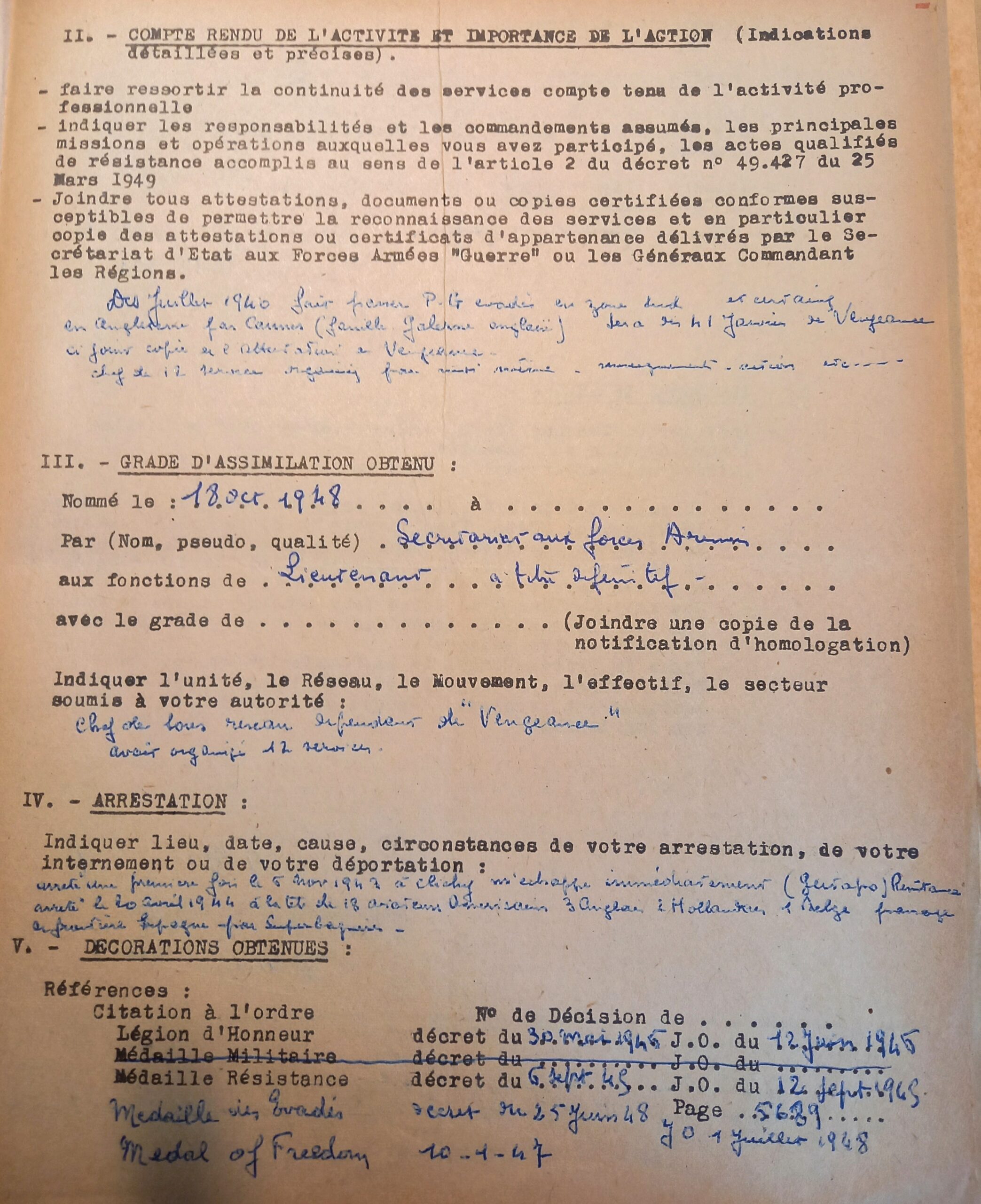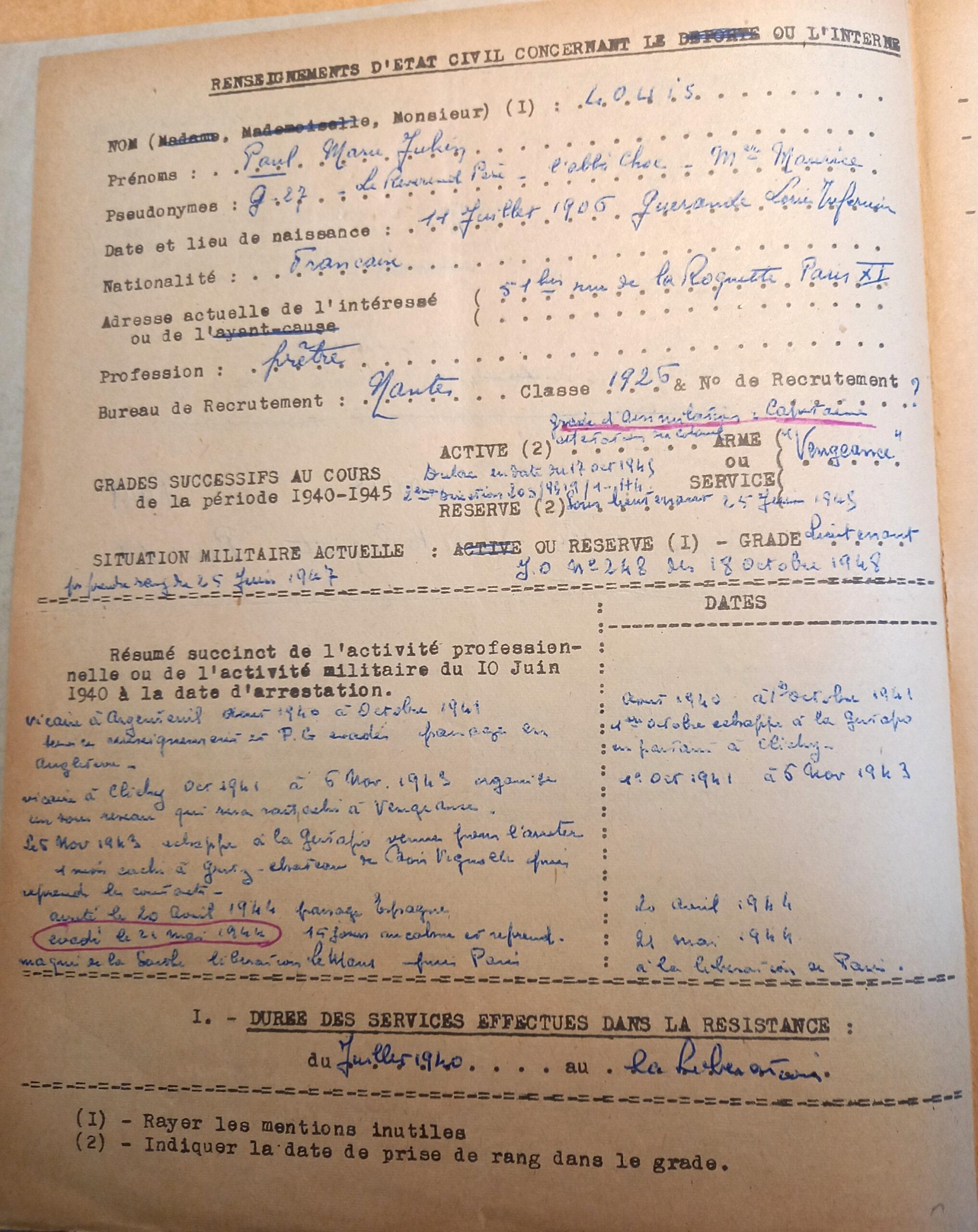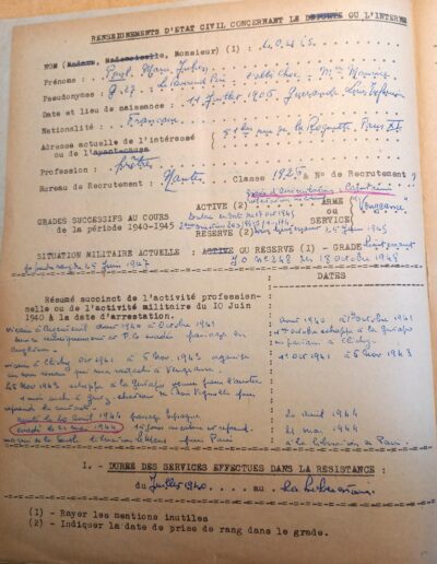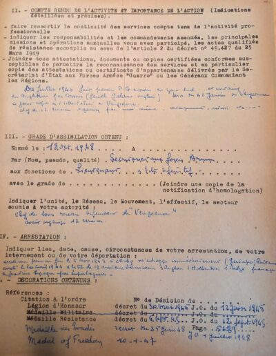 Demande d’attribution de grade d’assimilation dans la Résistance du père Louis, détaillant ses actions (1951, Service Historique de la Défense, GR 16 378185)