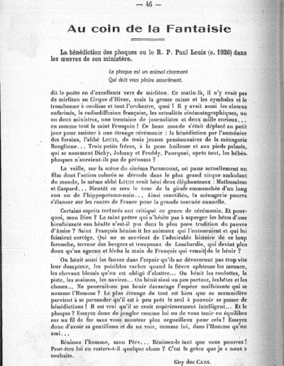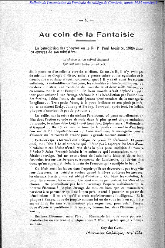Article de Guy des Cars, repris dans le Bulletin de l’association de l’amicale du collège de Combrée, sur les bénédictions d’animaux du père Louis (1953, archives diocésaines d’Angers)