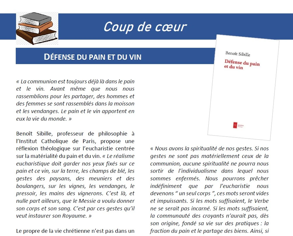 Benoît Sibille, professeur de philosophie à l’Institut Catholique de Paris, propose une réflexion théologique sur l’eucharistie centrée sur la matérialité du pain et du vin. « Le réalisme eucharistique doit garder nos yeux fixés sur ce pain et ce vin, sur la terre, les champs de blé, les gestes des paysans, des meuniers et des boulangers, sur les vignes, les vendanges, le pressoir, les mains des vignerons. C’est là, et nulle part ailleurs, que le Messie a voulu donner son corps et son sang. C’est par ces gestes qu’il veut instaurer son Royaume. »