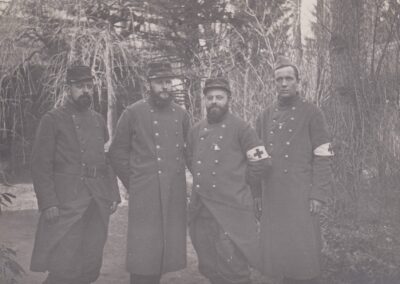 Soldats et aumôniers de l’ambulance 16. Le père Devuyst (1er à droite) est à côté d’un homologue israélite (1914-1915, archives des Fils de la Charité, 2540/60)