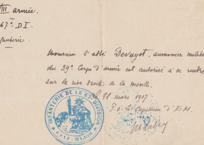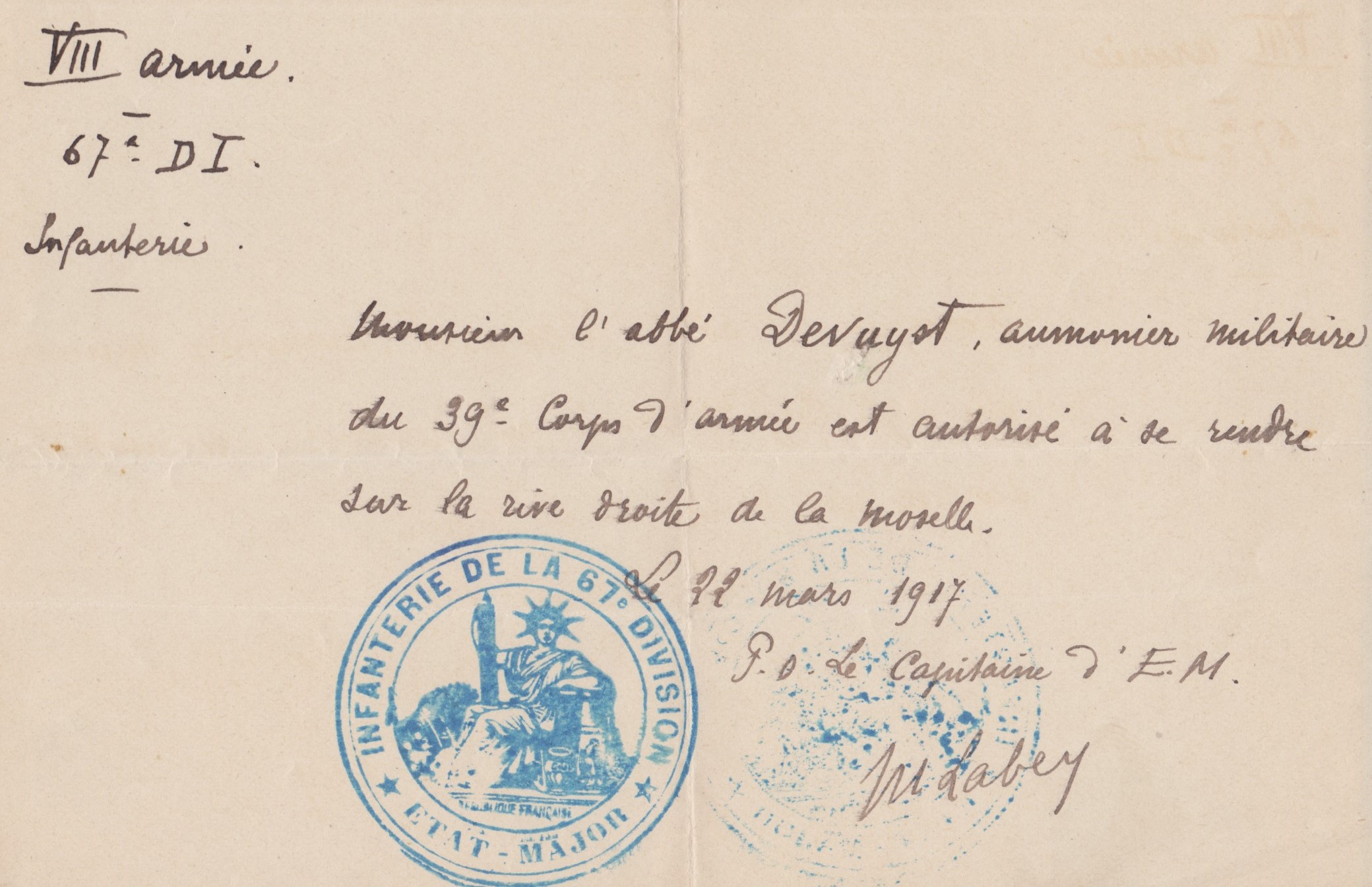 Autorisation accordée au père Devuyst de se rendre sur la rive droite de la Moselle (1917, archives des Fils de la Charité, 2E01/05)
