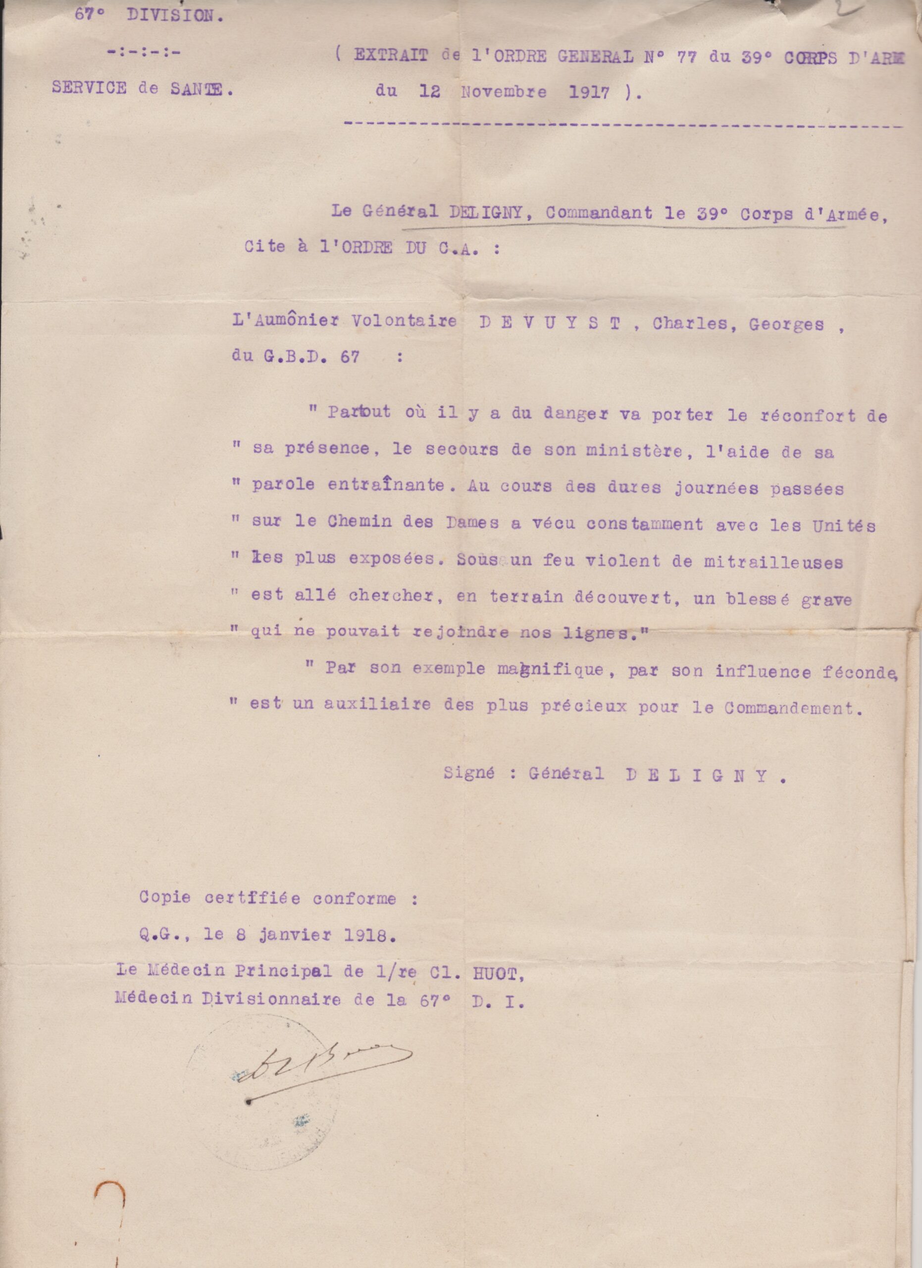Les nombreux combats des années 1917-1918 et la dureté de la vie au front montrent l’engagement du père Devuyst auprès des soldats, au péril de sa santé et parfois de sa vie. Dès le 22 mars 1917, il est autorisé à se rendre sur « la rive droite de la Moselle » dépendant de la 67e DI. C’est ainsi et naturellement que le 30 avril 1917, Devuyst passe sur ordre du général au GBD 67 attaché à la 67e division d’infanterie dépendante de la 8e armée.