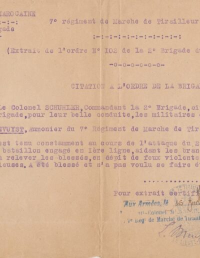Le père Devuyst et son unité sont alors affectés à la 102e division d’infanterie territoriale (DIT), qui est intégrée à la 6e armée, dès octobre 1915. Le 9 novembre, il est affecté comme aumônier volontaire. Ce statut officiel lui permet de porter la soutane, tout en gardant son brassard à la croix rouge. Tout aumônier était rattaché à une unité et sa présence garantissait la liberté de culte des soldats. Outre les tâches propres à son ministère, l’aumônier jouait un rôle humanitaire auprès des services de santé et sa présence auprès des soldats était un véritable soutien moral. La 6e armée où le père Devuyst est affecté comme aumônier volontaire avait été assemblée avec des unités très hétéroclites, dont la brigade des chasseurs indigènes du Maroc, rejoignant les quelques 600 000 soldats issus des colonies françaises enrôlés dans la guerre.