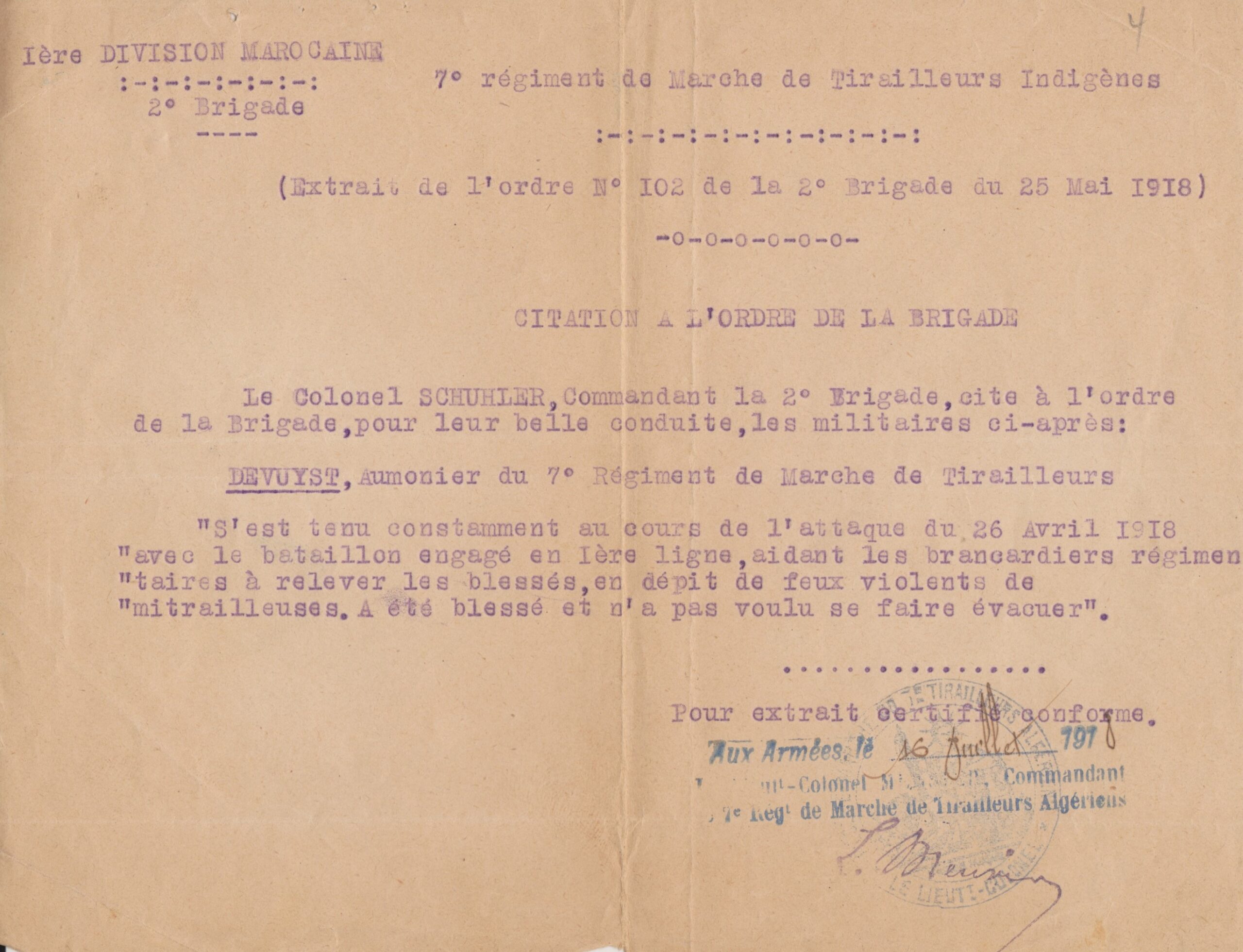 Le père Devuyst est nommé en janvier 1918 à la 2e brigade de la 1ère division marocaine. En effet, le GBC de cette brigade disposait d’un aumônier protestant et d’un aumônier israélite, mais pas catholique. Devuyst est donc nommé le 1er avril 1918 pour pallier ce manque. La guerre de mouvement reprend après la paix signée par les Bolcheviques avec les Allemands, qui ont pu rapatrier de très nombreuses divisions. Les Allemands lancent l’offensive dont un axe est sur le secteur de la division marocaine. Dans une lettre à Alexandre Josse, le père Devuyst, épuisé par la guerre, lui parle des « difficultés incessantes et accablantes » qu’il vit, ajoutant même qu’il « souhaite ardemment être blessé pour sortir de cette situation ».