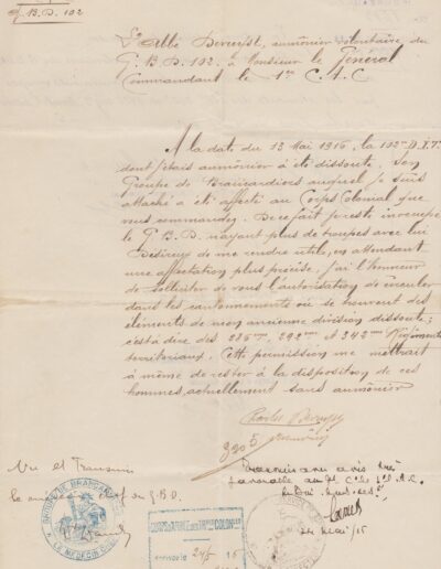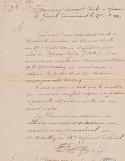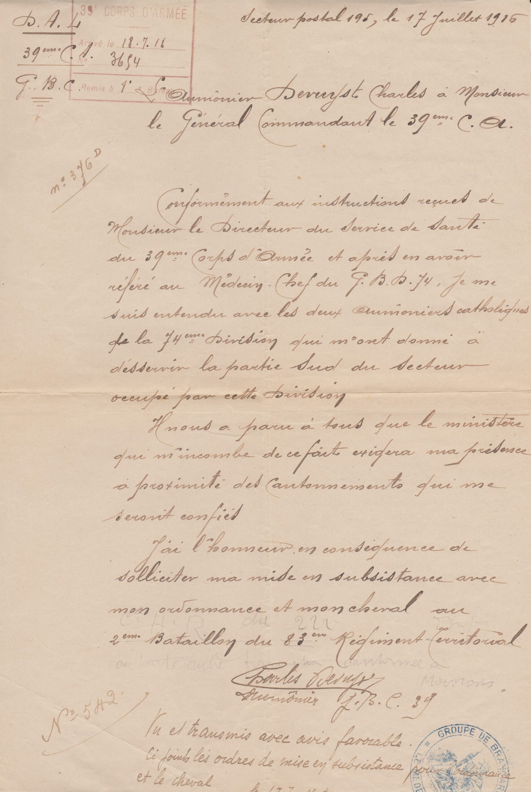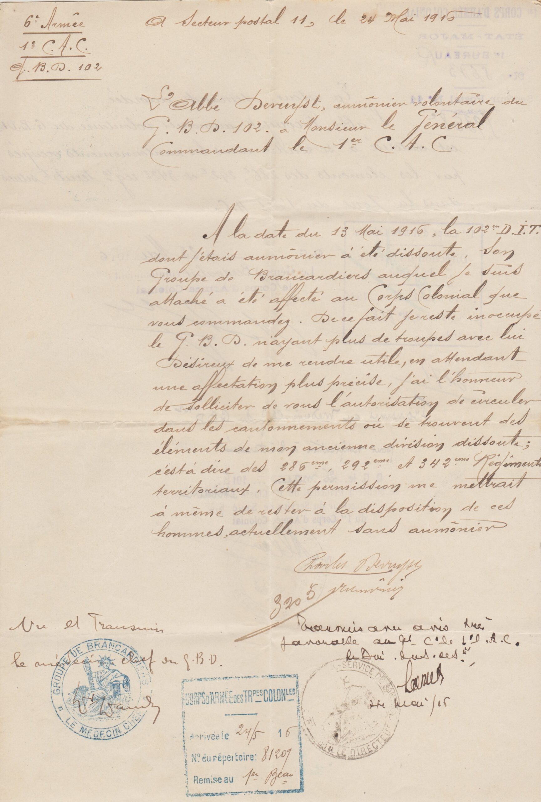 Demande du père Devuyst de circuler dans les cantonnements de son ancienne division dissoute (1916, archives des Fils de la Charité, 2E01/05)