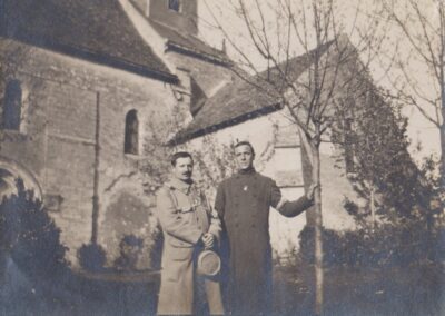 Le père Devuyst et un soldat devant une église (1914-1915, archives des Fils de la Charité, 2540/60)