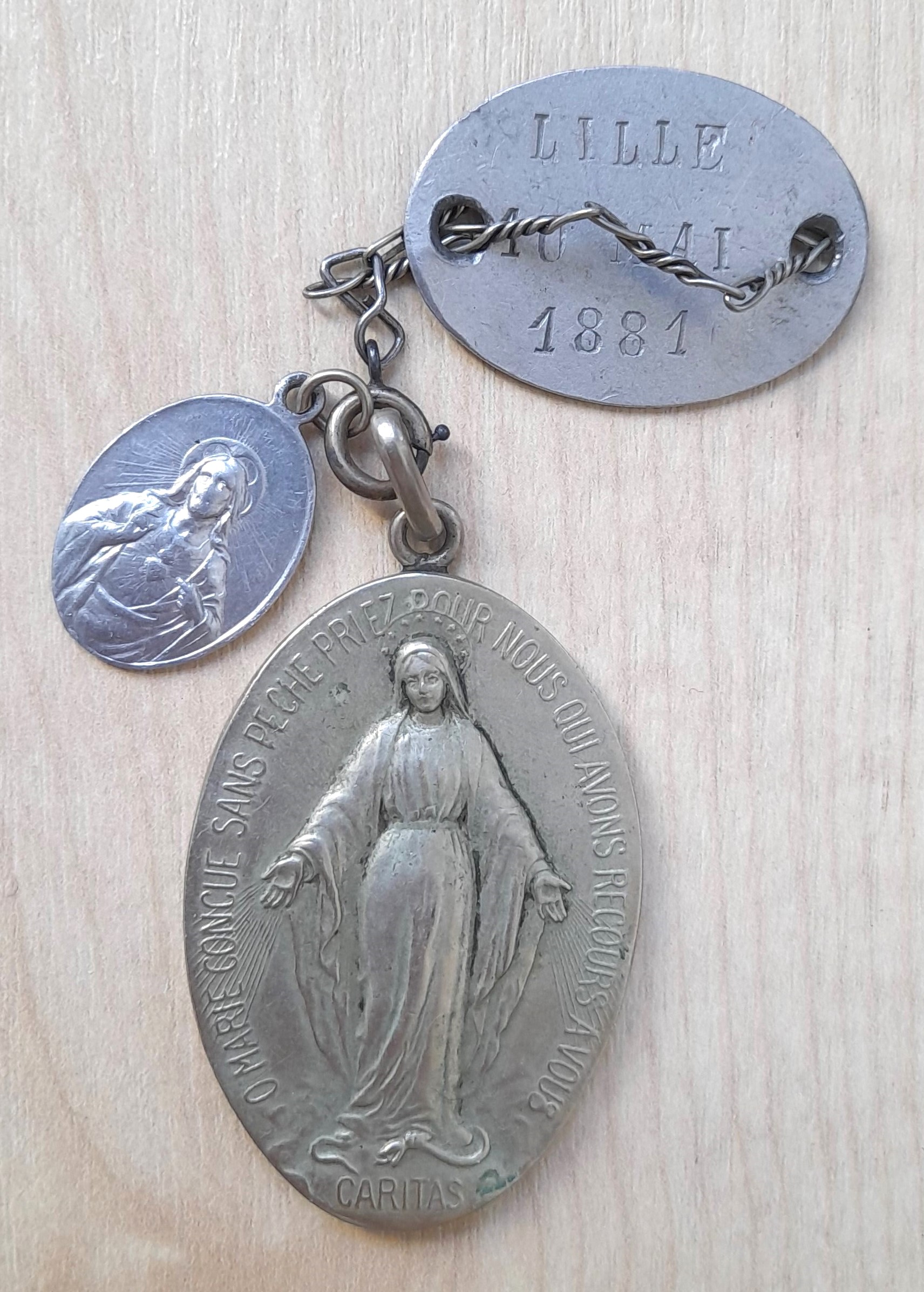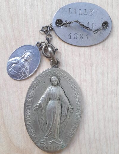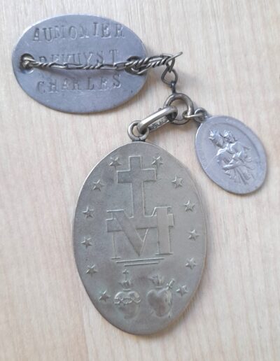Médaille miraculeuse et croix d’aumônier militaire du père Devuyst (1914-1918, archives des Fils de la Charité, n°623)