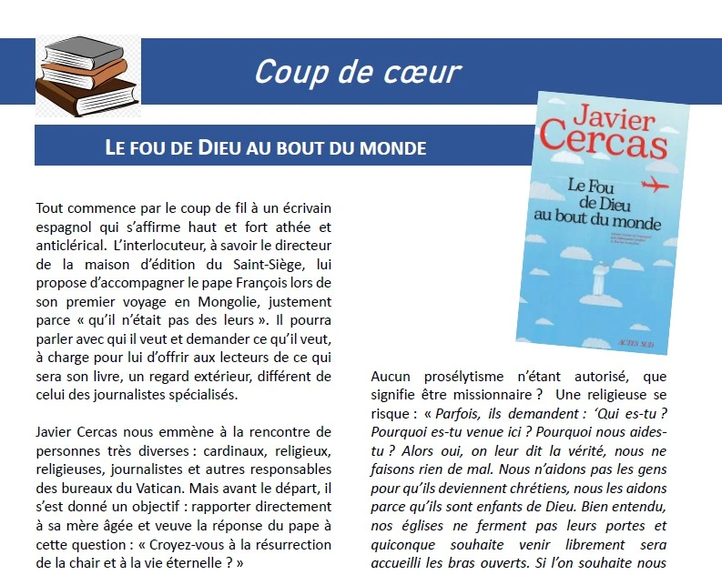 Tout commence par le coup de fil à un écrivain Espagnol Javier Cercas qui s’affirme haut et fort athée et anticlérical. L’interlocuteur, à savoir le directeur de la maison d’édition du Saint-Siège, lui propose d’accompagner le pape François lors de son premier voyage en Mongolie, justement parce « qu’il n’était pas des leurs ». Il pourra parler avec qui il veut et demander ce qu’il veut, à charge pour lui d’offrir aux lecteurs de ce qui sera son livre, un regard extérieur, différent de celui des journalistes spécialisés.
